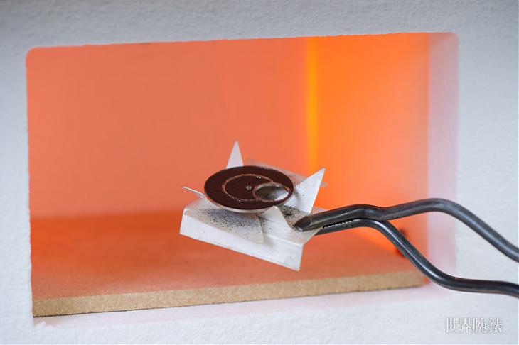 ▲微繪琺瑯屬於琺瑯三大工藝中難度最高者,因為其非常講究工藝師的繪畫天賦以及色彩美學,圖為屬於琺瑯製作過程的烈焰技術,其為琺瑯釉彩能否固定上色的關鍵。