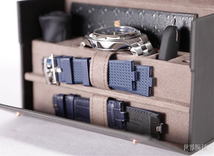 新版Overseas還有一項大受市場好評的新設計在於風格的自由作主,這看起來有點抽象,但其實關鍵因素並不複雜,就是直接來自江詩丹頓所推出的錶帶快拆裝置,把錶翻到錶背,就會看到12點和6點方向有一個徒手就能操作的分離/扣合機關,而且每款新版的Overseas都會內附鍊帶、皮帶和膠帶給錶主,後兩者的顏色會視錶殼材質以及面盤顏色有有所不同,例如這款藍面計時碼錶就是深藍色膠帶和皮帶。近幾年高級運動錶不斷有正裝化的傾向,除了外型設計上不再一味強調誇張狂放,透過錶帶的搭配組合,也能快速俐落地轉換整只錶給人的觀感,例如我們在從事運動或休閒活動時可以選擇鍊帶或膠帶,若出席比較正式的場合又能換成皮帶,有點像是一錶三吃的概念,全方位的搭配性,成為新版Overseas錶主都很享受的一個特點。