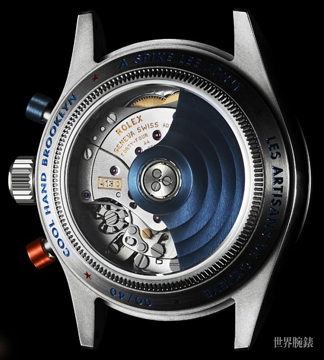 錶背的帥度不比正面差,一來它使用了透明底蓋,再來它連自動盤也一樣用上了藍色,據LAG表示,這是他們將22K金材質加以加工處理使其呈現出少見的藍色,不過機芯方面最大的改裝重點也就出自自動盤,其他部分依舊是Daytona採用多年的4130機芯,擁有三日鍊動能,不過從面盤字樣多少也可以推測它並不是勞力士最新的頂級天文台認證產物,這表示在每日走時精準度上,這枚4130機芯可能還不到±2秒這種水準,但是勞力士機芯的品質還是不需替它擔心太多。