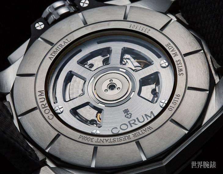 錶背使用了透明底蓋,而底蓋邊緣則有彷彿延伸自12個時標的12道刻槽,乍看好像輪胎的概念,不過既然是套用在海軍系列上,那麼解讀成船艦的明輪或是船舵或許會更貼切一些,另外值得注意的是透明底蓋並沒有限制了Admiral AC-One計時碼錶的性能水準,它依舊有高達300米的防水深度效果,維持強力運動員的好體魄,其中也代表著崑崙的防水科技的確是研發有成。錶款搭載的CO 116機芯用上了整片圓形的鏤空自動盤,此舉多少阻隔了佩戴者欣賞機芯的視野,但從自動盤的設計也可看出品牌針對它的配重有花了一番功夫研究,如果這樣能夠提升上鍊效果,相信犧牲些視覺觀賞性也是值得的。