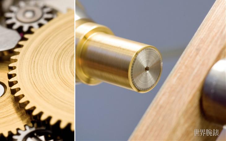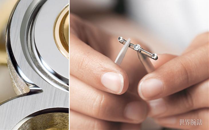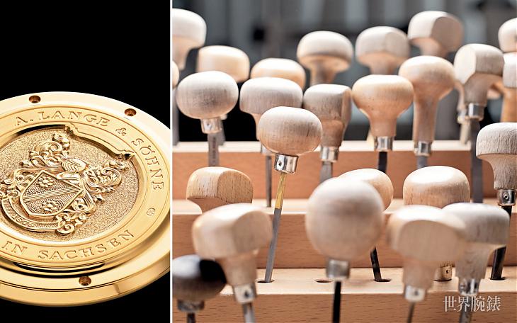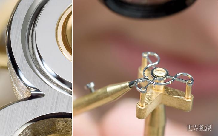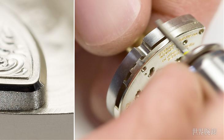 最能體現時計精美絕倫的莫過於內斂出色的細節。這也是收藏家欣賞錶款的第一步:觀察錶橋和槓桿的內角。如果其稜角分明且線條筆直,不容置疑這必定是手工打磨的結果,因為只有人手才能進行這樣筆直的打磨操作以達到這種效果。如果內角圓潤,便證明這是機器操作。朗格的修飾工匠使用一種鉛筆形的硬金屬工具打磨內角。他們完全以手工切割和修飾這些內角。
