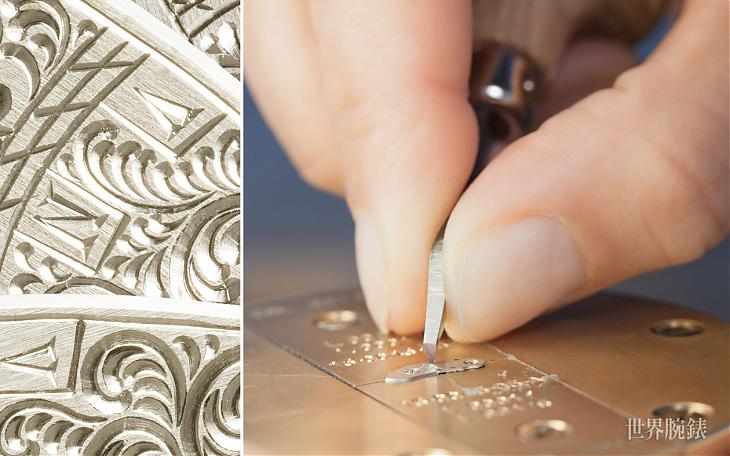 每枚朗格錶都配備一個手工雕花擺輪夾板或陀飛輪夾板。Lange 1 Time Zone的機芯更配備一個附加的中間輪夾板,同樣以高超雕琢工藝裝飾。好幾個世代以來,擺輪夾板的雕刻圖案始終如一:夾板中心的螺絲以花瓣環繞,花卉圖案則巧妙地勾勒出部件別具風格的輪廓。與此同時,每個雕刻圖案均獨一無二。切口的深度和雕刻的曲線就像是指紋一樣,使得每只錶都顯得與眾不同。