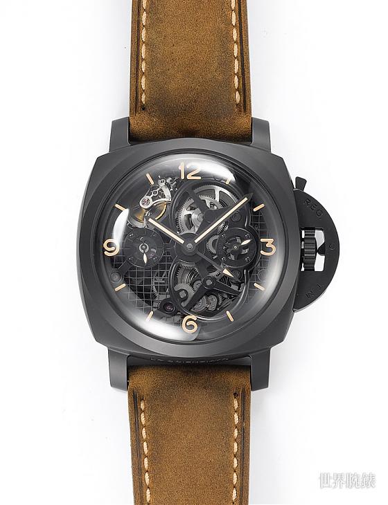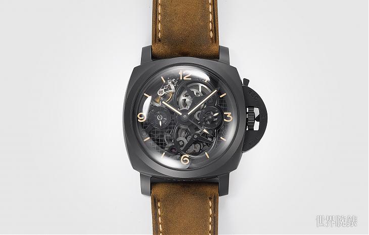 PAM00528/黑色陶瓷材質/P. 2005/S手動上鍊機芯/時、分、小秒顯示/陀飛輪裝置/兩地時間顯示/日夜顯示/動力儲存顯示/藍寶石水晶鏡面、透明底蓋/防水100米/錶徑48mm/約NT$ 5,200,000