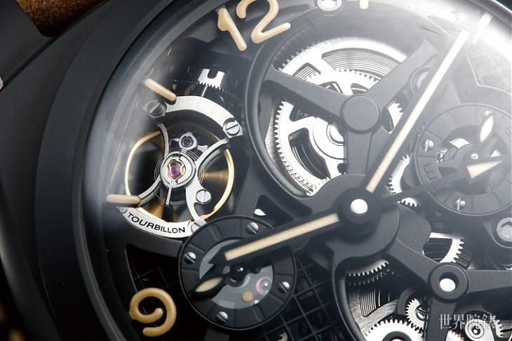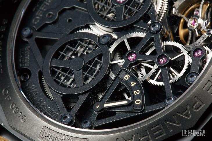 ▲沛納海P. 2005的陀飛輪相當特殊,除了是採垂直方向自轉,自轉週期也是高速的30秒一圈。原本面盤封起來的時候小秒盤下有一個轉盤顯示陀飛輪的運作狀態,鏤空版也保有這個功能。