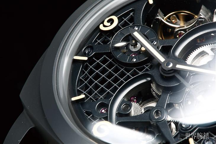 就像前面提到的,機芯的基板、夾板是以電鍍處理成黑的,不過錶殼仍然是氧化鋯的陶瓷材質,然而也因為「黑的方式」不同,機芯和錶殼的色澤打光看起來會有點落差。有鏤空的程度來說錶款(正面)的左半邊挖得頗乾淨,右半邊發條盒的部份就沒那麼透明了,不過整體而言還是相當不錯,而鏤空的板路也一本沛納海自製機芯(尤其是鏤空的)的風格,線性、格狀的線條都很有建築工業感,相當有品牌特色。