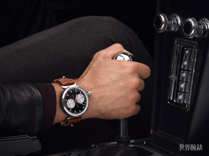 賽車的密碼亦可見於兩個白色計時盤的高清晰辨識度指針、時刻與計時功能。12點鐘位置的30分鐘計時盤與6點鐘的小秒盤成縱向對齊,令人聯想到Minerva錶廠昔日所製造的拉力賽計時器,面盤中央的紅色計時秒針沿著流速計刻度環運行,可用於計算固定距離的速度。