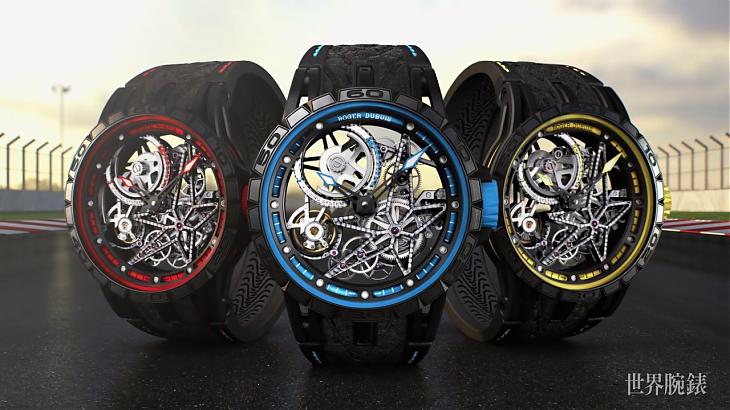 接著,ROGER DUBUIS與Pirelli倍耐力輪胎合作推出的Excalibur Spider Pirelli自動鏤空腕錶同樣精彩萬分,該錶款融合活力炫目的藍色、紅色和黃色,在腕間重現賽道之上的風馳電掣。此款限量時計由賽事中獲勝的Pirelli倍耐力輪胎橡膠皮製成,其內面裝飾獨特的胎面紋路,散發勝利者的豪邁氣質。倍耐力擁有長期賽場經驗,深知輪胎顏色扮演著功能識別的角色,於是從中汲取靈感彰顯腕錶特性。 Excalibur Spider Pirelli-Automatic Skeleton 自動上鍊鏤空腕錶以DLC鈦金屬材質打造直徑45毫米的錶殼,黑色DLC塗層鈦合金凹槽錶圈,搭配同色調裝飾元素。機芯部分,它搭載RD820SQ自動上鍊鏤空機芯,這是品牌首度將此鏤空概念與廣受歡迎的820SQ機芯結合而進行創作。ROGER DUBUIS的研發團隊極致發揮其技術專業與美學才華,以巧奪天工的技藝賦予鏤空機芯星辰般的靈透氣質。最後,這只腕錶限量88只,而且為了向同時深植於兩個非凡品牌基因中的勇創賽績特質致意,它所搭配的錶帶也以曾經在賽事中贏得勝利的Pirelli倍耐力輪胎皮製作,並且在其內面裝飾獨特的胎面紋路。