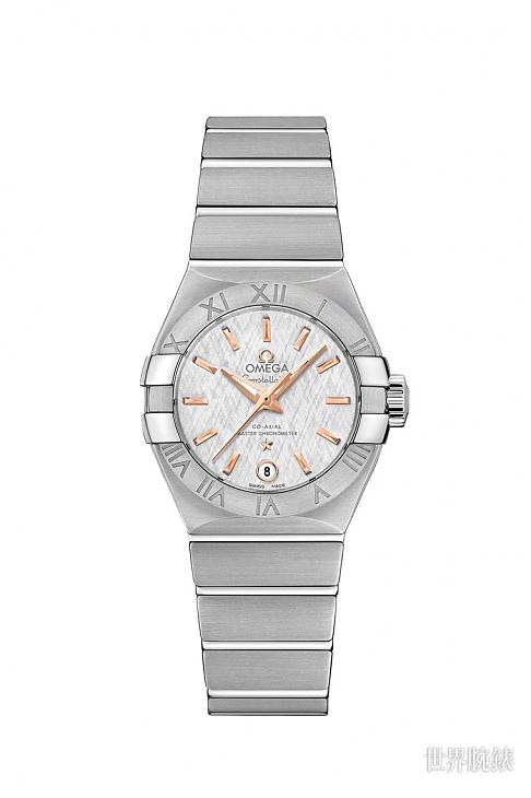 全新歐米茄星座系列大師天文台女士腕錶綻放嶄新精彩美學,尺寸27mm銀色蛋白石面盤上襯著絲綢刻印圖案設計,搭配18K金時標或11顆鑽石時標襯以18K金底座,以及刻有羅馬數字與星座經典「扣爪」18K金或不鏽鋼錶圈,襯托柔美的女性特質,同時搭載8700大師天文台機芯,蘊含無盡內在美。