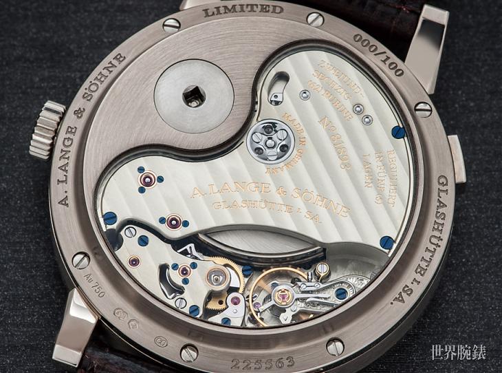 翻至錶背也可以看出錶款與其他朗格腕錶的差異,包括透明底蓋邊緣突起的立面可以看出機芯相對佔有更多的垂直空間(錶殼實際厚度為15.9mm,猶如高複雜腕錶的境界),錶背左上角有一個像是「鑰匙孔」的設計,方便錶主將上鍊鑰匙置入並用以旋轉發條上鍊,上鍊系統還多了整合式後擋棘輪以及扭力限制器等特色,前者能夠讓上鍊過程更輕鬆流暢,後者則猶如一個警報器,能在上鍊逼近臨界點時適時喊停,從而確保錶款的耐用性不會因為一時疏忽就產生嚴重影響;之所以要採用一個特殊的鑰匙上鍊系統乃是因為若以傳統的錶冠上鍊方式,則要轉完31日的動能會是一個十分令人頭痛的浩大工程,這有違佩戴便利性的原則,也促使朗格尋找更完善的解決之道。