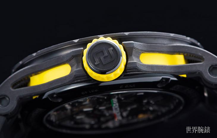 這款Excalibur Aventador S腕錶的外殼是由複層碳纖維和鈦金屬等組成,由於前者的關係,使得錶殼會呈現帶有層狀的不規則紋理,除了外觀造型很顯眼,一般看到這種外殼的直覺反應就是:輕量化,這點反映出超跑為了追求極致速度,因而大量使用碳纖維材質的目的。另外鈦金屬錶冠外部以黃色橡膠包覆,一來是要呼應腕錶細節的配色(連結Huracán Super Trofeo EVO的車色印象),再者橡膠材質也有助於提升止滑力,所以佩戴者操作腕錶時也會更得心應手。