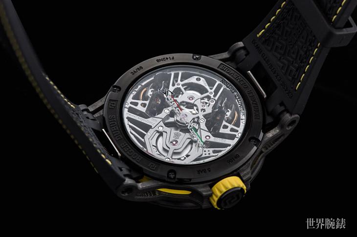 除了上述跟賽車有關的設計之外,錶款在面盤外圈、分鐘刻度、秒針、時分針尖端等處都是黃色,再次呼應了跑車的車身塗裝。另外錶背透明底蓋中間印有“"Aventador S"字樣更是一目了然整只錶的設計淵源,機芯底板上還會驚喜發現日內瓦印記的加持,可見這枚機芯不只是看起來華麗、講起來優質,經過客觀機構的檢測下,它的品質證明是端得上高級錶檯面的厲害角色。最後連錶帶也同樣有料,羅杰杜彼採取Rubber-tech橡膠面料搭配橡膠的複合材質組合,錶帶表面的顆粒狀紋理讓它看起來多了些層次感,而錶帶橡膠邊框使用的黃色縫線又呼應了整體造型的思維,是相當點題的製錶巧思。