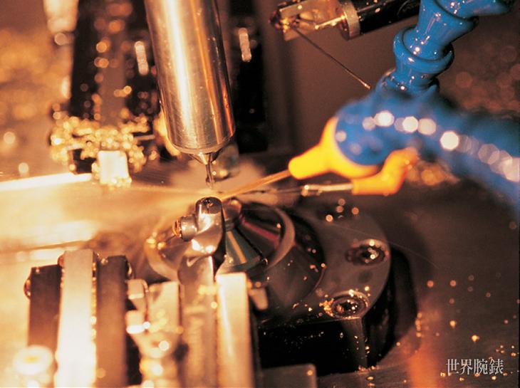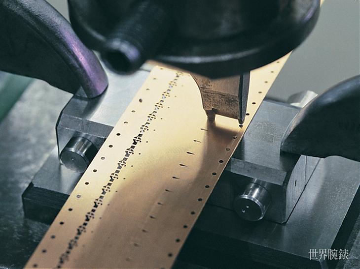 經過幾個連續工序,指針會以黃銅片沖壓而成,其中,僅製作百年靈標識就需要三道工序。隨後使用鑽石機械為指針進行拋光。鉚接指針的針管通過電腦數位機器操控,由一條三米長的黃銅棒加工而成。鑽孔精確到±2微米,相當於一根頭髮直徑的1/30那麼細!