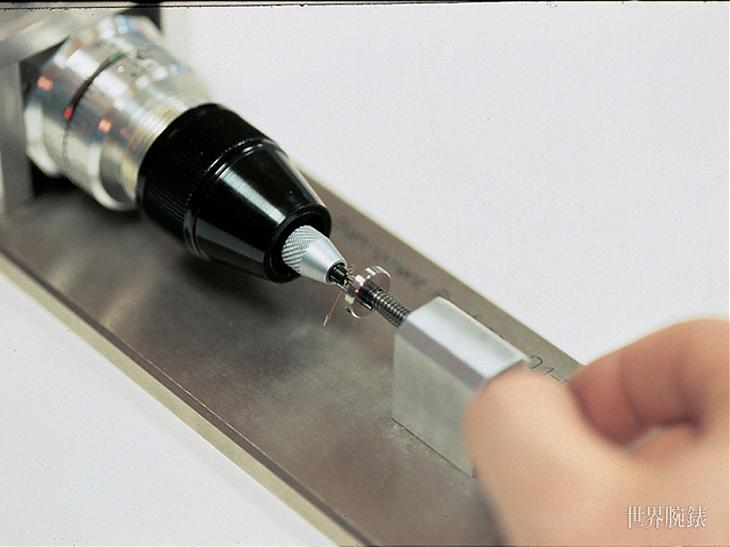 鑽孔完成後,技師會對這些細管(內徑0.25mm,外徑0.5mm)進行嚴格檢查,然後使用鉚固工具將指針固定於針管之上,這是一項精細的工作,需要靈活、精準的操作方能完成。為驗證鉚固品質,在計時碼錶歸零重設操作時採用旋轉扭矩的測試,確保指針能夠承受0.3N.cm的扭矩。