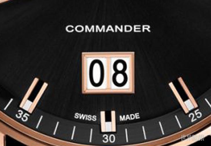 全新系列腕錶延續了Commander系列為人喜愛的設計特色,例如質地純淨的緞面打磨放射紋面盤、四周環繞緞面打磨的圓形不鏽鋼錶殼,以及醒目搶眼的拋光錶圈等。Commander系列先前僅在女錶款式上有單純日期顯示的設計,一般來說男錶最基本的功能都還有日期加上星期的顯時作用,不過這次新款作品別開生面地在男錶上推出單一日期顯示設計,日期窗進化成由兩個圓盤組成的大日期,提供佩戴者更一目了然的讀時效果。
