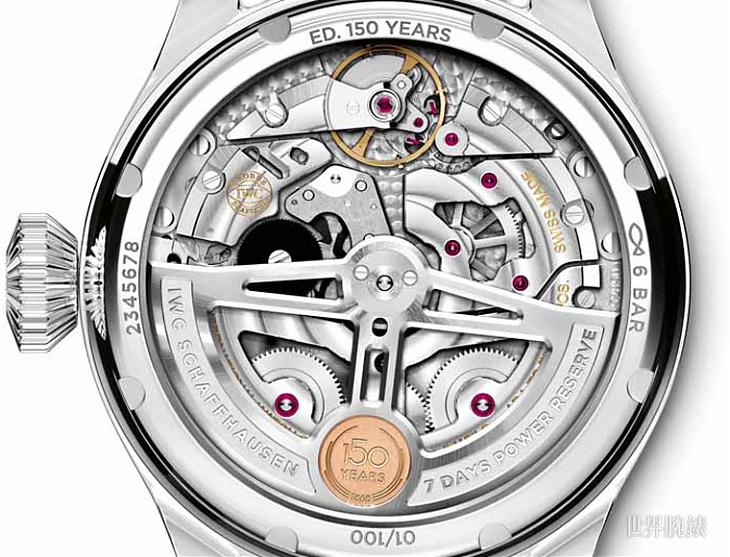 錶款雖然屬於紀念款,不過採用的是比較親民的不鏽鋼錶殼(錶徑46mm),同時錶背用上了藍寶石水晶底蓋得以露出機芯,值得一提的是在透背的前提下,錶款還是擁有60米的防水性能。底蓋下呈現的是品牌自製的52850機芯,機芯主要規格包括36石、4Hz震頻以及長達七日的動力儲存,鏤空自動盤上有個小彩蛋就是原本自動盤中間偏下方位置的金質圓環改成了150週年的紀念字樣,而從底蓋邊緣也能發現錶款的限量編號,透露它只限量100只的珍貴價值。