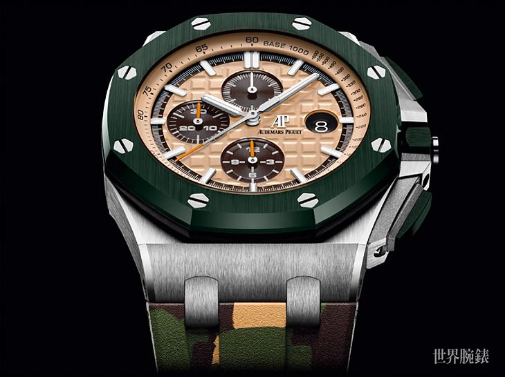 腕錶面盤採用了和綠色陶瓷錶圈極具反差色調的米色,並保留鐫刻"Grande Tapisserie"大型格紋裝飾圖案。而腕錶左三眼布局的計時碼錶加上日期顯示小錶盤則以棕色呈現,採用白金立體時標與皇家橡樹指針,各功能藉由色彩學都能達到良好的讀時效果。為呼應綠陶瓷錶殼和米色的面盤,愛彼特別搭配了迷彩橡膠錶帶和另附加一條卡其綠色橡膠錶帶。