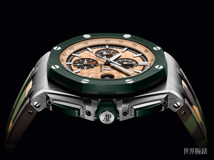 比系列原著的42mm更大的44mm不鏽鋼錶殼,全新皇家橡樹離岸型自動上鍊計時碼錶不論是錶圈、錶冠或是計時按把皆是首次以綠色陶瓷製造,並搭配卡其色面盤和迷彩橡膠錶帶,極有叢林氣息,軍錶味甚濃。「綠色陶瓷」在鐘錶界並非首創,但仍是少數,然而在愛彼工匠親手雕刻、磨砂、拋光之下形成光潔、冷酷卻不失前衛的質感,給予綠色陶瓷不一樣的風貌。而陶瓷材質的處理方式極具挑戰性,需要高超的技巧與極大的耐心,但是能夠完成後幾乎不會刮傷的表面,可承受高溫與熱衝擊並傳承許多年,因此作為腕錶的錶圈具醒目和保護作用。難得一見的是,愛彼將綠色陶瓷運用在許多方面,包含突顯重點的按把、錶冠或錶圈,都是業界首見讓綠色元素均勻分佈,達到視覺的平衡美。