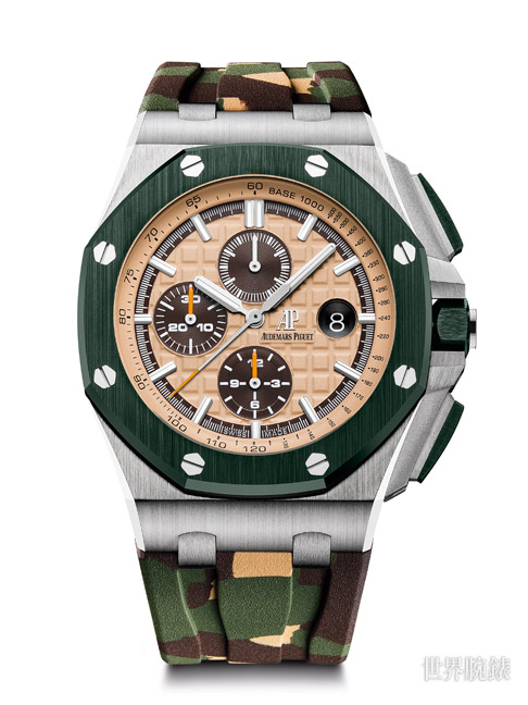 ▲換上迷彩色系後的AP皇家橡樹離岸型自動上鍊計時碼錶運動氣息甚濃。