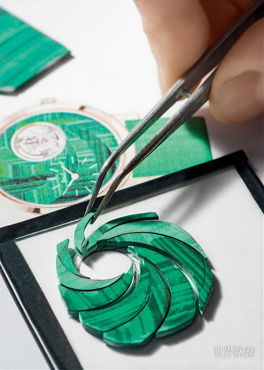 玫瑰金錶殼內,瑰麗的孔雀石迴旋出千變萬化的色彩︰祖母綠、松綠、深綠及淡綠,交織濃淡有致的層次。機芯以高級製錶工藝鐫刻環形日內瓦波狀飾紋,主夾板和錶橋呈現手工打磨的環形波紋,配備的錶橋和陀飛輪框架更以手工描花和倒角處理修飾。