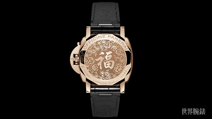 ▲PAM00908的錶背裝飾華麗的「福 字!「福」字也分別被梅花和牡丹簇擁,寓意堅毅不屈及花開富貴。