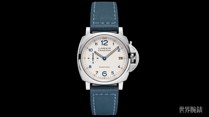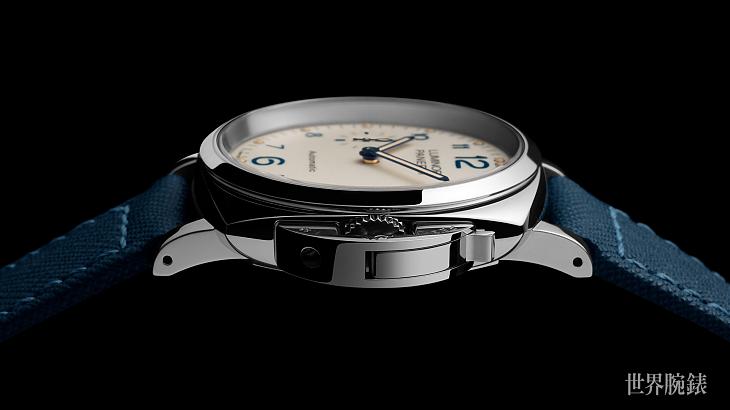 ▲Luminor Due 3日動力儲存自動錶也搭配象牙白色的面盤,錶冠則是由沛納海於1956年獲得專利的經典護橋桿保護裝置。