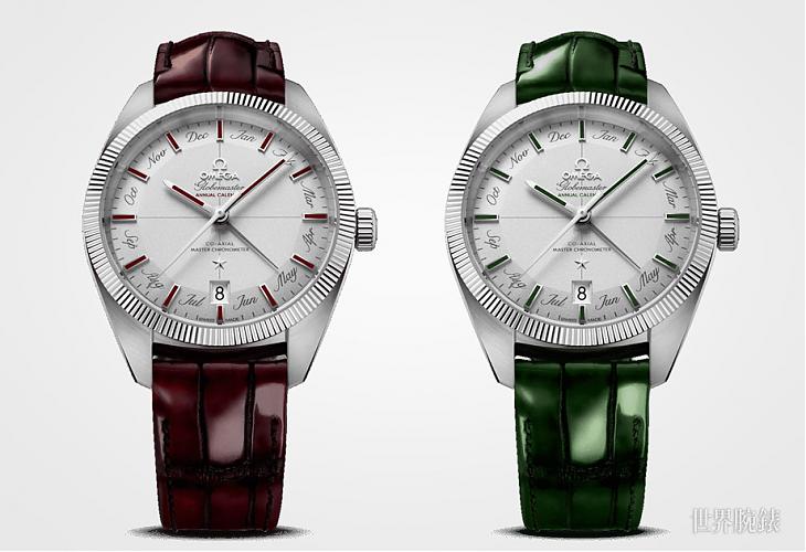 ▲除了市售版,歐米茄也推出兩款白金限量版Globemaster年曆錶,時標內填酒紅或綠色琺瑯,與錶帶色澤兩相呼應,就連錶背中央天文台徽章也飾以內填酒紅色琺瑯,收藏價值更上層樓。