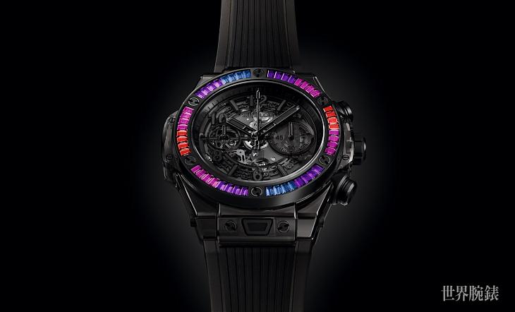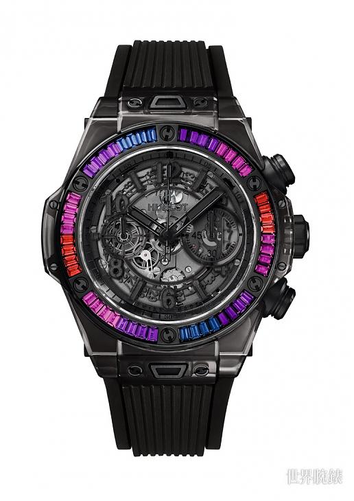 黑色藍寶石水晶材質/HUB 1242 UNICO自動上鍊機芯/時、分、小秒、日期顯示/計時碼錶功能/錶圈鑲寶石48顆/藍寶石水晶鏡面、透明底蓋/防水50米/錶徑45mm/限量50只/參考價:NT$ 2,747,000