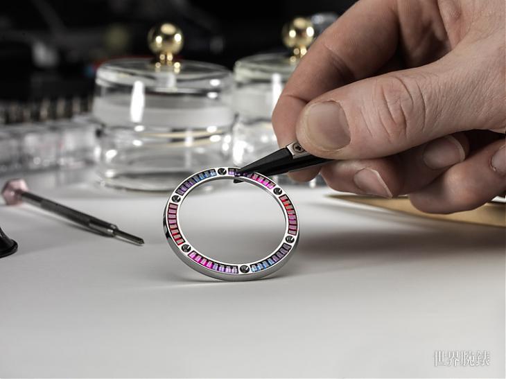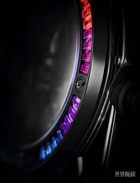 ▲錶圈上的多色寶石象徵宇宙中各種恆星的細微光譜變化,賦予彩色寶石鑲嵌除了裝飾美感之外,更具畫面聯想的效果。