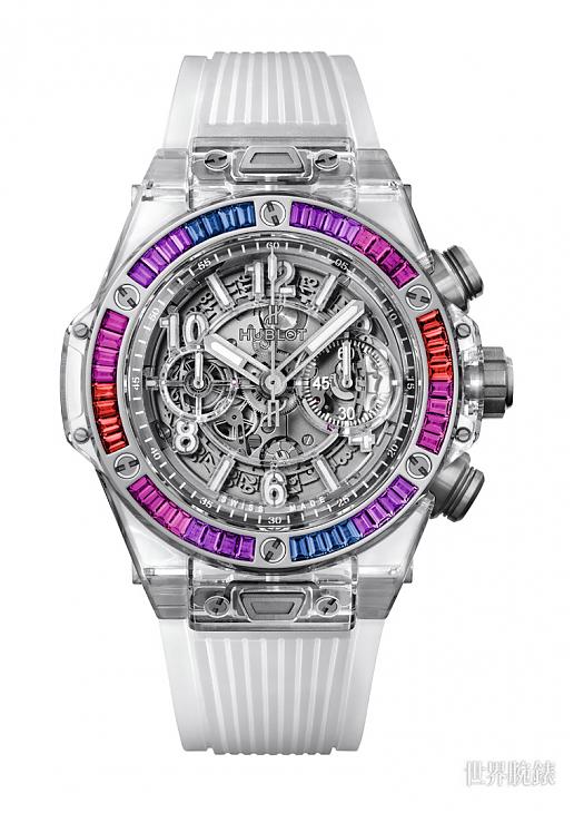藍寶石水晶材質/HUB 1242 UNICO自動上鍊機芯/時、分、小秒、日期顯示/計時碼錶功能/錶圈鑲寶石48顆/藍寶石水晶鏡面、透明底蓋/防水50米/錶徑45mm/限量50只/參考價:NT$ 2,584,000