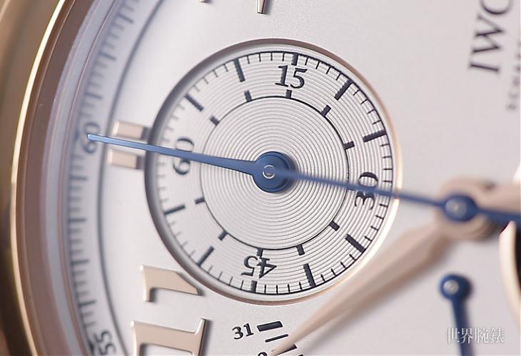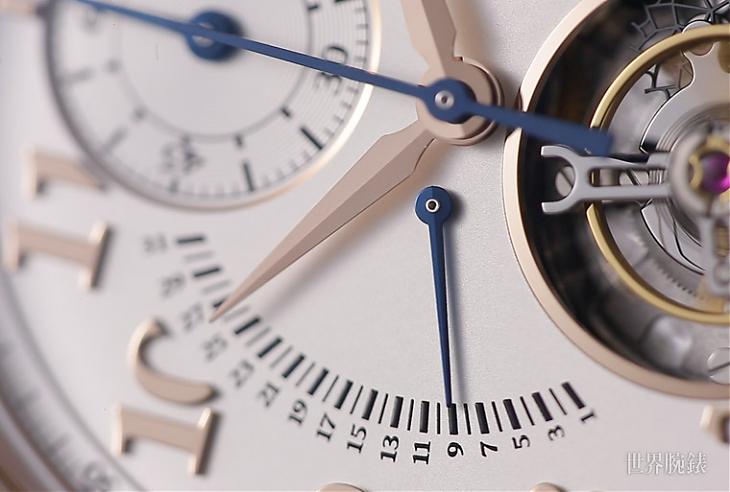 至於在整只錶中具有畫龍點睛效果的設計出現在面盤9點方向的逆跳日期顯示,逆跳顯時對IWC來說並非什麼新鮮嚐試,過去在葡萄牙系列就有這種設計前例,但是此次逆跳指針的位置安排卻充滿新意——其軸心相當接近中軸指針,使得日期刻度能印在接近時標之處,這種設計能與3點方向的品牌Logo左右對稱,讓面盤的佈局看起來更為工整且和諧,即使身負陀飛輪、計時與逆跳等三多重功能,整體仍顯得有條不紊。