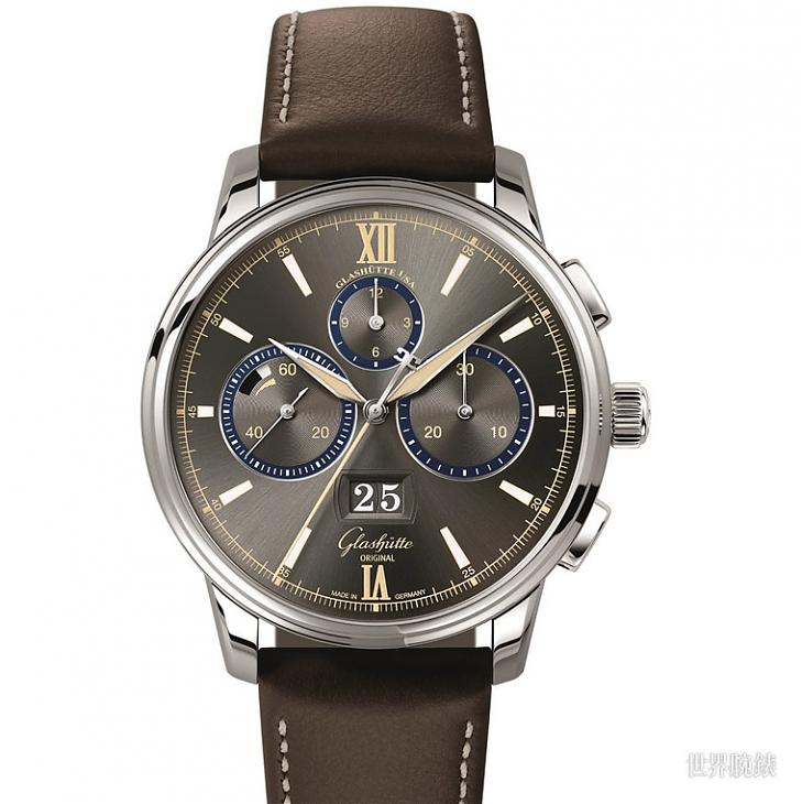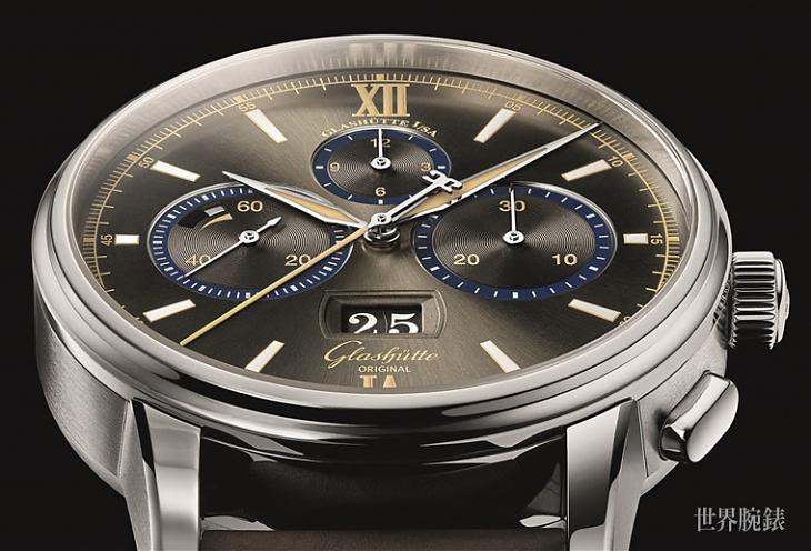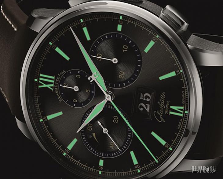 ▲在面盤6點鐘位置,配置了標誌性的格拉蘇蒂原創大日期顯示,而動力儲存顯示窗以巧妙方式設於小秒盤內。