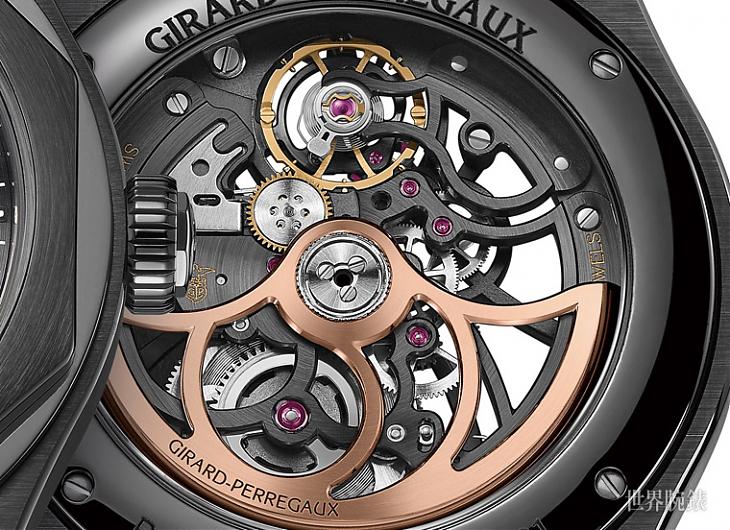 如大部分的鏤空腕錶,Laureato Skeleton Ceramic的面盤只留下了一個黑色分鐘刻度圈於外圍,圈上鑲嵌有金屬小時刻度,並於12時位設置了GP標誌。Laureato Skeleton Ceramic面盤中央透視出內裡的 GP01800-0006自動上鍊機芯,其機芯夾板經過黑色PVD處理,與全黑的腕錶造型相呼應。GP01800-0006是芝柏表的自製機芯,過去曾應用於1966 Skeleton及Laureato Skeleton之中,其直徑30.6毫米,厚度4.16毫米,具小三針功能,震頻為每小時28,800次,配18K玫瑰金自動盤與All Black陶瓷錶殼形成強烈視覺對比,動力儲存為54小時。