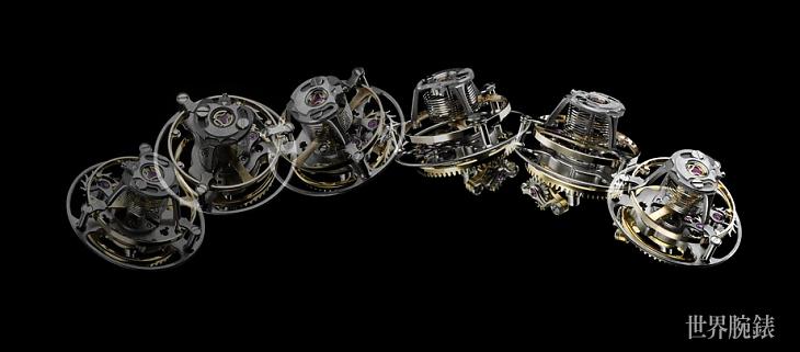 ▲光陀飛輪裝置的零件便高達105枚,其中陀飛輪框架採質量輕的鈦金屬製成,使其內外各以15秒與30秒繞行雙軸運轉時,能減輕動力負擔並提昇運作穩定性。