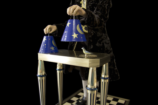 轉動鑰匙,魔術師流暢的動作立刻吸引住所有人的注意,他的頭隨著身體左右轉動,眼神靈動、和諧流盼。魔術師動作靈敏,眨眼之間便從桌面上變出一只全手工精心雕琢的小鳥。繪色的鳥形精美逼真,轉動自如,當飛鳥輕舞羽翼,鳥尾與鳥喙也自然靈動,更有清脆的鳥鳴令表演更為生動。如果你以為此時表演已結束,那真是小看了這位紳士的本領。魔術師再一次優雅地提起手中鈴鐺,神奇的事情發生了,剛才還活蹦亂跳的鳥兒突然銷聲匿跡。當你正為眼皮底下發生的奇跡摸不著頭腦時,魔術師仿佛讀懂了你的心思,眨著雙眼為你揭開另一只鈴鐺。即刻,清脆的鳥鳴將你從困惑中喚醒,不禁為這位“技藝高超”的魔術師鼓掌歡呼!