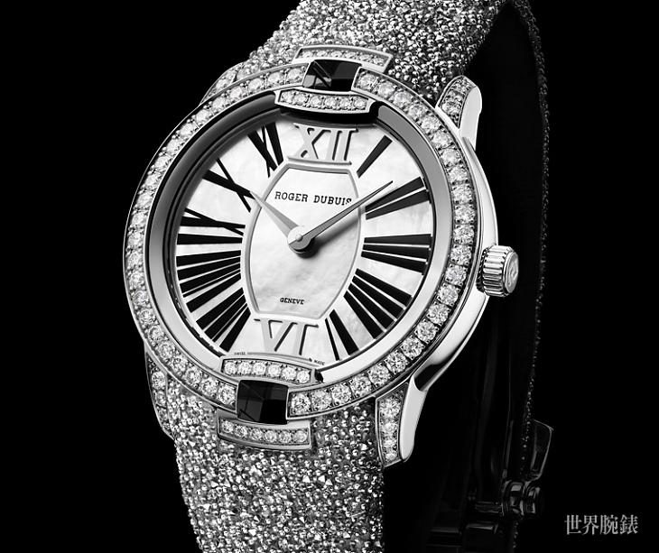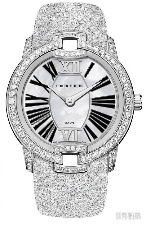 白金材質/RD830自動上鍊機芯/時、分顯示/珍珠母貝面盤/錶款鑲鑽100顆,約重1.76克拉/藍寶石水晶鏡面/防水30米/錶徑36mm/參考價:NT$ 1,310,000