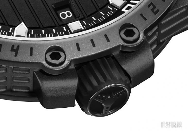 ▲腕錶的錶冠擁有偌大的直徑,由榫肩及橡膠鑄模保護,以確保更安全可靠且易於操作的性能。