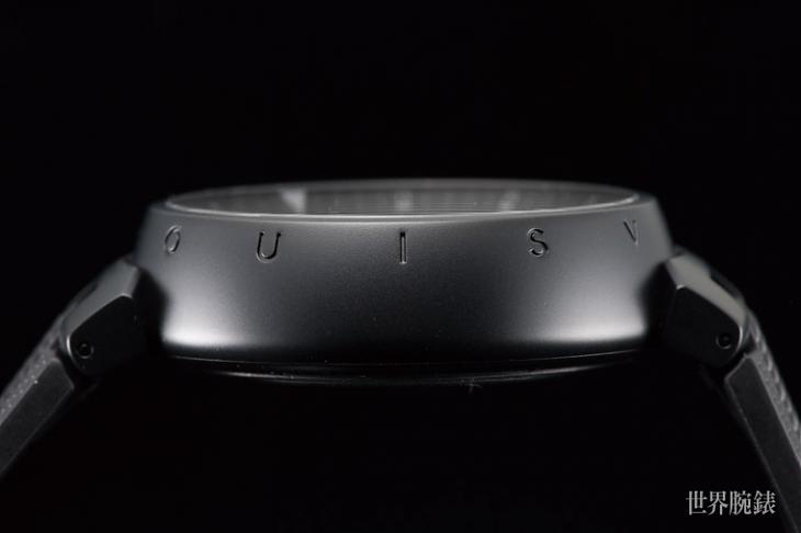 Tambour腕錶推出迄今仍保有初代作品傳承的諸多特徵,例如獨樹一幟的鼓狀錶殼造型、錶殼側面鐫刻圍繞著”LOUISVUITTON”的12個字母以及八邊形錶冠和特殊的錶耳設計等,多年來早已在人們心中深植鮮明印象。此次品牌新推的Tambour All Black仍沒有意外地依舊維持上述的招牌風格,不過與過往不同的是,路易威登將不鏽鋼錶殼PVD上一層霧面黑色鍍層,包括錶殼、錶耳以及面盤等都採用了全黑的色調,只在時標、指針與日期盤等處留白(前兩者有加上Superluminova夜光物料),令錶款藉由顏色對比效果收到清晰顯時的效用。