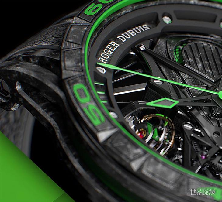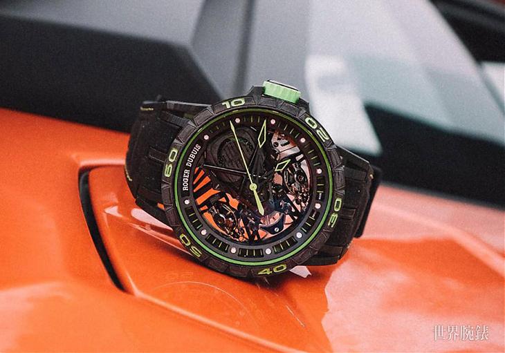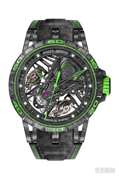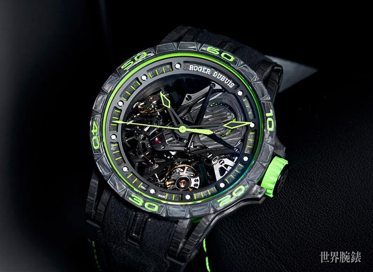 ▲新款Excalibur Aventador S腕錶以高性能跑車常用的螢光綠色塗裝為靈感,在錶殼與面盤等細節元素上使用該色調,搭配在碳纖維錶殼上相當醒目。