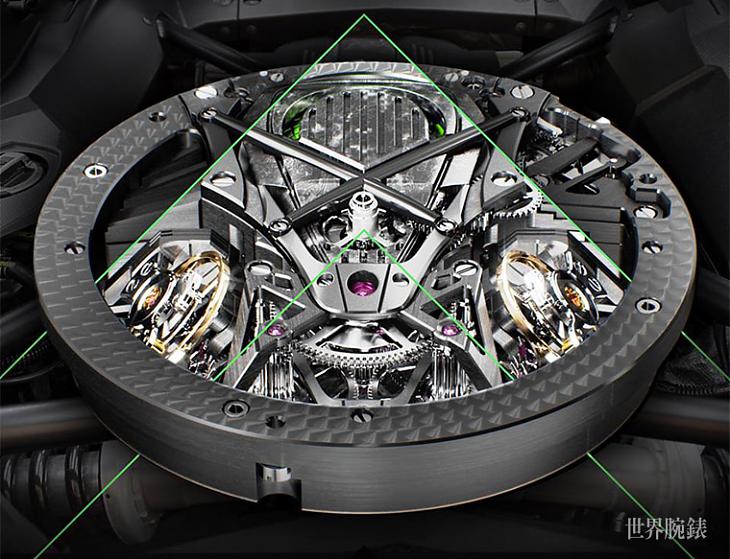 ▲羅杰杜彼由賽車世界擷取機芯的創作元素,最終採取雙擺輪的形式仿效V12汽車引擎的構造,同時也藉由傾斜45的雙擺輪設計,達到提升走時精準度的目的。