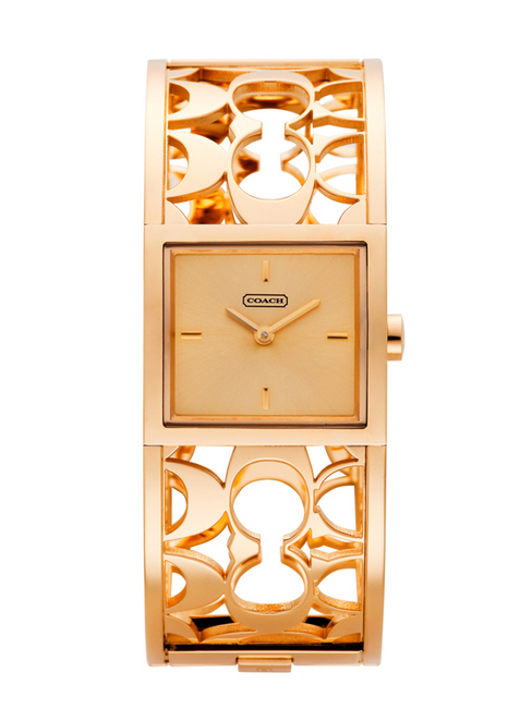 COACH Miranda鏤空手鐲手錶今年冬天提供兩種錶款可供參考:低調時尚的銀白色及炫麗耀眼的金黃色。俐落簡約的方形錶盤點綴同色系的指針及時刻,並巧妙結合以品牌指標性的C Logo字母為設計理念的弧線鏤空鐲帶,為此款華麗優雅的手錶增添活潑繽紛元素,無論是日常配戴或出席party皆能讓您成為人群中最受人矚目的時尚焦點! COACH Miranda 2012冬季系列採限量發行,售完為止!