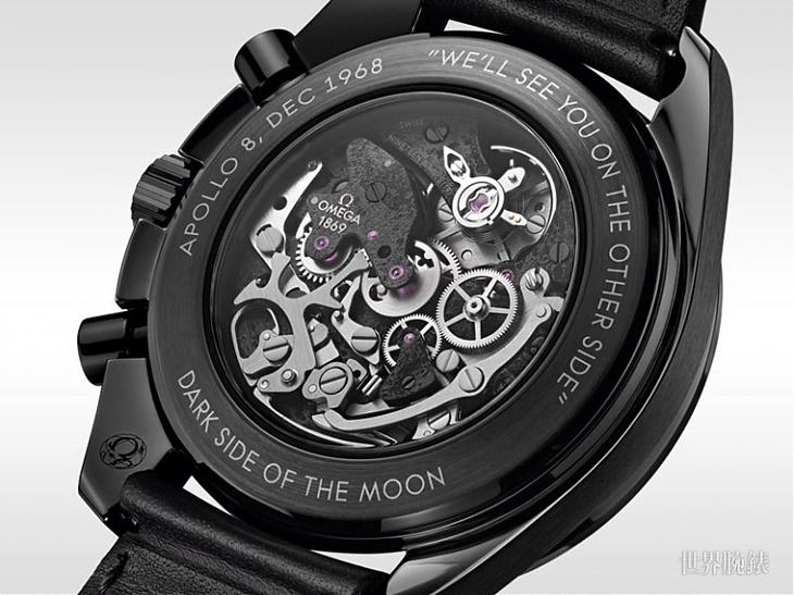 此外由於詹姆斯.洛弗爾(Jim Lovell)在阿波羅8號啟程往月球暗面前,向地面控制中心所說的最後一句話是”WE'LL SEE YOU ON THE OTHER SIDE”(我們將在另一面與你們再會),成為這項任務中一段很經典的橋段,於是錶款在透明底蓋上也刻印了該字句字樣用以突顯創作淵源。錶背機板表面的雷射呈現的是只有太空人方能看到的月球暗面,同時一方面也展示出腕錶內的1869機芯。