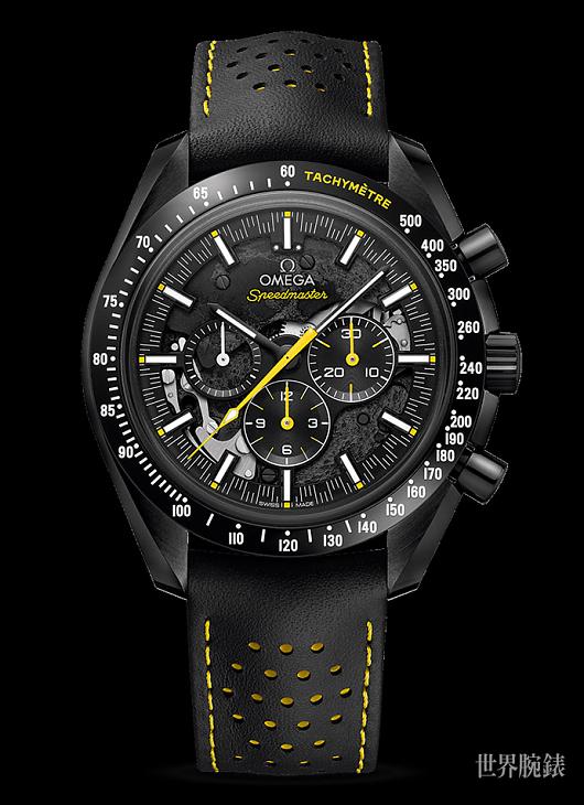 腕錶設有黃色亮漆計時指針,而測速刻度及錶冠則覆以白色Super-LumiNova超螢光塗層。”Speedmaster”及”Tachymetre”字樣亦同樣採用黃色設計。
