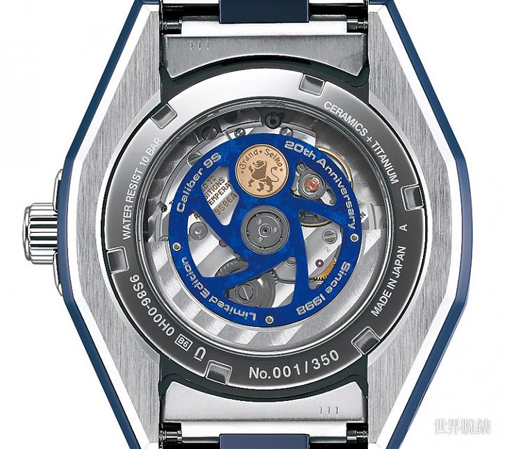 搭配藍寶石透視背蓋下的自動盤,由鈦金屬與鎢金屬製成,可防止當腕錶遭受衝撞時變形。自動盤鈦金屬部分則以陽極氧化處理,此方式打造出了全新的豐厚鮮明藍色,與GRAND SEIKO藍的陶瓷、面盤相呼應。此錶款運用了先進材質和製錶技術。如此的製錶理念,從20年前研發第一只9S機芯時,即開始而不斷延續至今。
