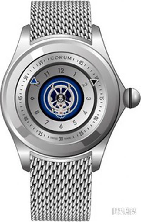 腕錶不設指針,小時和分鐘刻度設於凸緣之上,兩個三角形標記游走其間;黑色標記指示分鐘,另一個指示小時。陀飛輪則指示秒鐘。最後是泡泡腕錶的拱形藍寶石鏡面。CORUM的許多錶款均巧妙利用其放大鏡(中央)和變形(邊緣)效果,締造不同的視象。如今亦不例外:拱形鏡面頂部對正下方的陀飛輪具有放大鏡效果,讓觀者自然領略細節之妙。