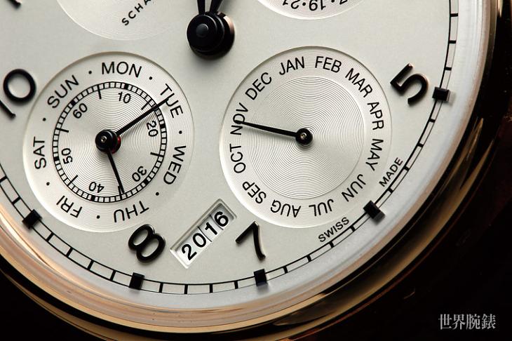 ▲四位數的年份顯示是克勞斯萬年曆的一大特徵,其中百位和千位的數字可以持續到22xx年。6點鐘是月份顯示,跟左右兩個雙針同軸的子面盤比起來稍嫌單薄,當有Logo印在上面的時候就好得多。
