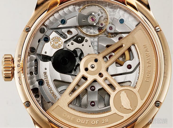 這次我們介紹的這款是台北101專賣店限定的特殊款,錶款的基底是白面玫瑰金款,特殊版在正面將面盤上的所有指針和時標都做了黑化處理(原本是玫瑰金色的),翻過錶背則是將原本自動盤上的IWC Logo換成了台灣,旁邊寫上"ONE OUT OF 28/FOR TAIWAN",也就是說它限量28只,但不做流水編號,而最近這種例子似乎愈來愈多了,某個程度上也讓大家省掉了搶編號的煩惱(不過量還是得搶啦)。
