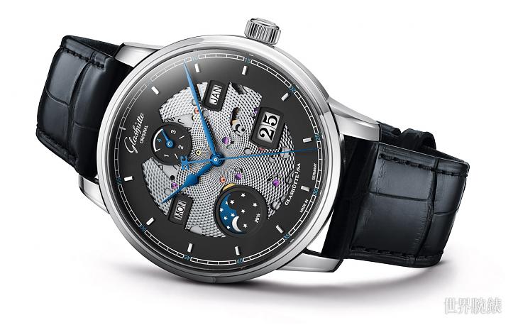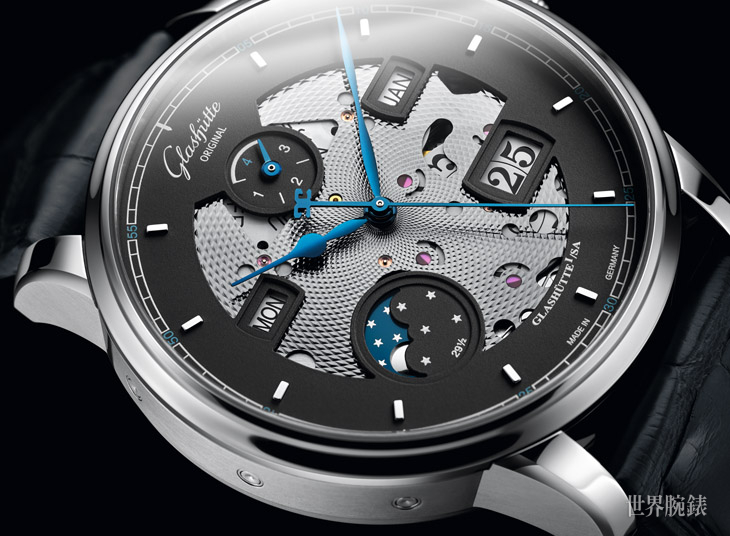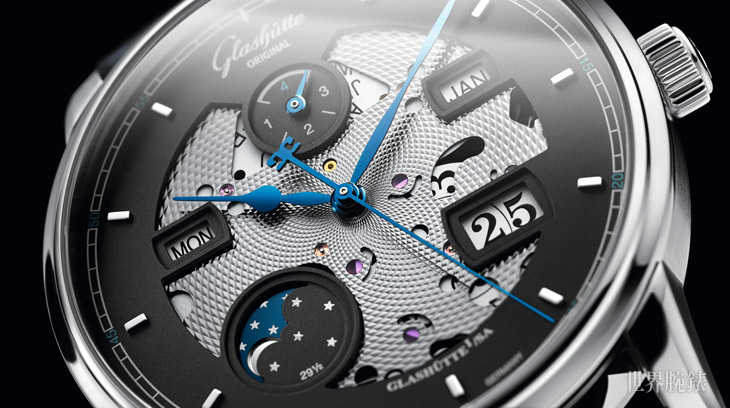面盤的鏤空在各個零件中切割出精細開口,長久以來一直是製錶大師展現高超技藝的方式之一。而今,GLASHÜTTE ORIGINAL透過這項手藝實現讓人耳目一新的現代設計。霧面灰色面盤精細切割出大日曆、月相、星期、月份和閏年顯示,每個顯示窗都帶有畫框般的細膩線條。中間的切口讓人將關注焦點轉移到電鍍灰色模組蓋板的工藝上,蓋板開口則顯露出日曆盤的互動。精美的璣鏤裝飾點綴機芯蓋板,一路蔓延的線條僅有個別紅寶石將其中斷。製錶廠在佛茨海姆(Pforzheim)的自家面盤廠以手工精心完成璣鏤裝飾。製作過程中使用傳統璣鏤圖案雕刻工在面盤上精細繪製幾何圖形。根據光線落在面盤上的方式,微光閃爍的圖案會呈現出截然不同的外觀。