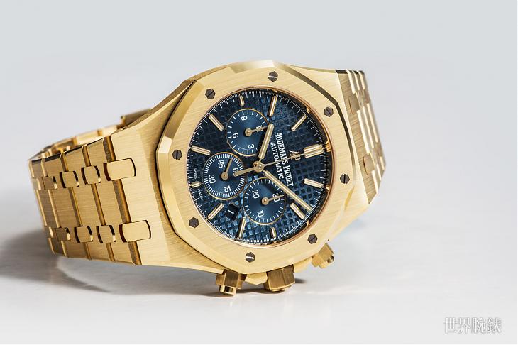 AUDEMARS PIGUET愛彼2017年新款中有批賣相相當好的就是改版的皇家橡樹計時碼錶,這次的新版大舉導入了雙色貓熊面,細節處也有若干微調,討喜的設計加上討喜的款式,是2017年被看好的銷售主力。不過就在前一年他們才剛剛推出了這款18K黃金的RO計時款,而這款仍舊沿用了原本的設計,於是乎現行的RO計時款遂分成了新舊兩種,而這款黃K金款也就成了「新的舊版」了。