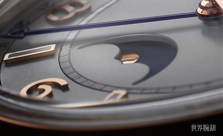 ▲面盤配色為乳光灰色與旭日紋外圈,加上藍色夜空裡的18K金質月亮,讓人倍覺唯美內斂。