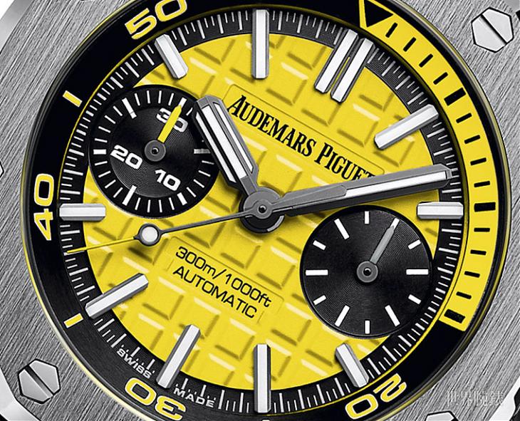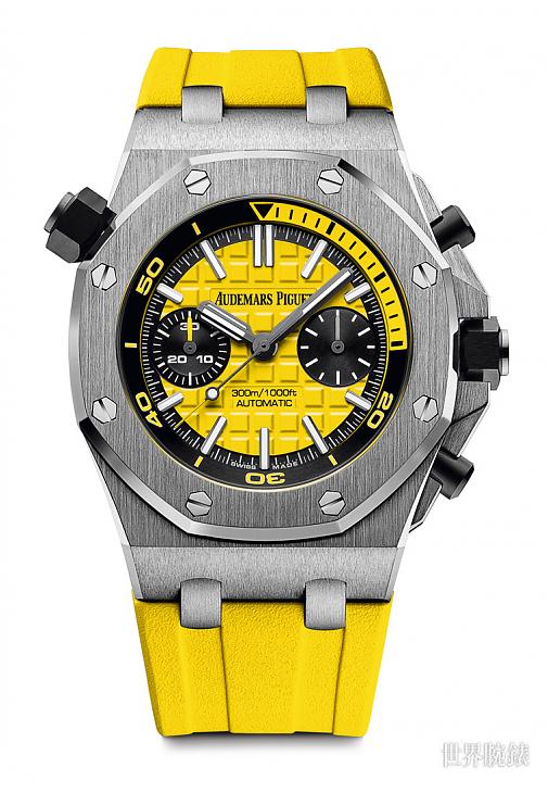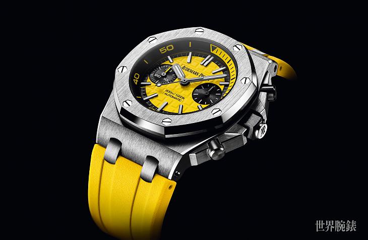 ▲Royal Oak Offshore Diver Chronograph除了黃面,還同步推出包括亮橙、深藍與萊姆綠等三種不同配色款式,比起傳統的黑面或白面更顯活潑耀目,讓整個系列散發出一種年輕朝氣,完美呼應其運動錶基因。